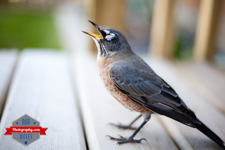 At first I just went out to see if he was ok, he kind of hopped up and moved over a little. The bird then sat there with his mouth open, opening and closing his eyes. The scene made me think of the Family Guy clip when Peter fell and hurt his knee haha. Since I ย had my camera ready to go I went and grabbed it and shot a few photos. He stayed on my deck for over 5 minutes (I even had time to change lenses), then he started hopping away. I followed him to see if he was going to be able to fly away. The bird eventually hopped across the street and into some bushes where he just sat there, I decided I’d better just leave him alone at that point and let him rest and gather him self. I’ll go check on him later to see if he made it out of there. I hope so!
