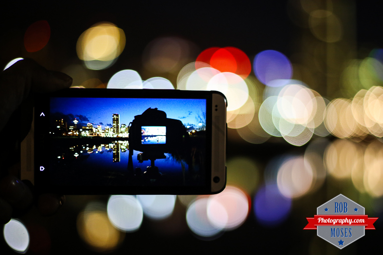 HTC ONE Calgary Alberta Canada Famous city Skyline water reflection Bokeh balls - Rob Moses Photography Photographer - Canon 5D3 5Diii 7D 5D mark iii 50mm Camera: Canon 5D mark iii & 50mm 1.8 mark i ~ Settings: 1/20th – f/1.8 – ISO 2000
