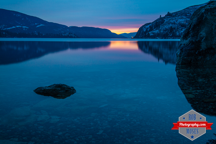 I shot this photo over the holidays in Vernon BC, Canada. My family and I went for a little walk down some train tracks and came across this little beach area down a small cliff. I shot a quick picture with my phone to test out the location and I liked the results (see Instagram pic here) so I came back another night when the water was more still. The picture didn’t turn out exactly how I had imagined. I was hoping the sky would have a little less clouds so the sunset light would have made it across the whole sky. Ah well, maybe next time :).