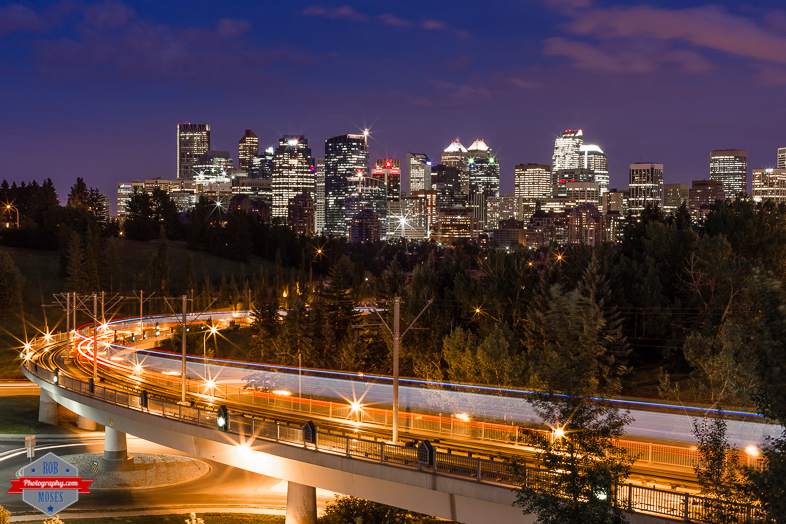 I shot this photo last night from SAIT (a local college). I got there a bit early and tried a few shots while it was lighter out, but I knew waiting till the sun when down more would give a much better effect. Once the sun went down more I waited for a train to go by so I could get the lights streaks in the shot. I had my camera on a 2 second timer, but timing for the train was still rather easy because just before the train comes into frame there is a cross walk with bells that ring. Anyhow, it was a nice night and I’m happy with the picture :).
