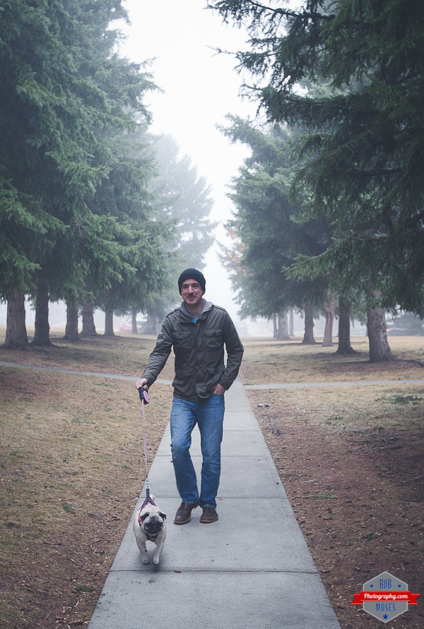 Man walking dog cute pug doggie path yyc fog foggy guy trees nice - Rob Moses Photography Calgary Photographer Photographers Native American Famous un celebrity Tlingit Ojibawa Top Popular Best Good Canadian