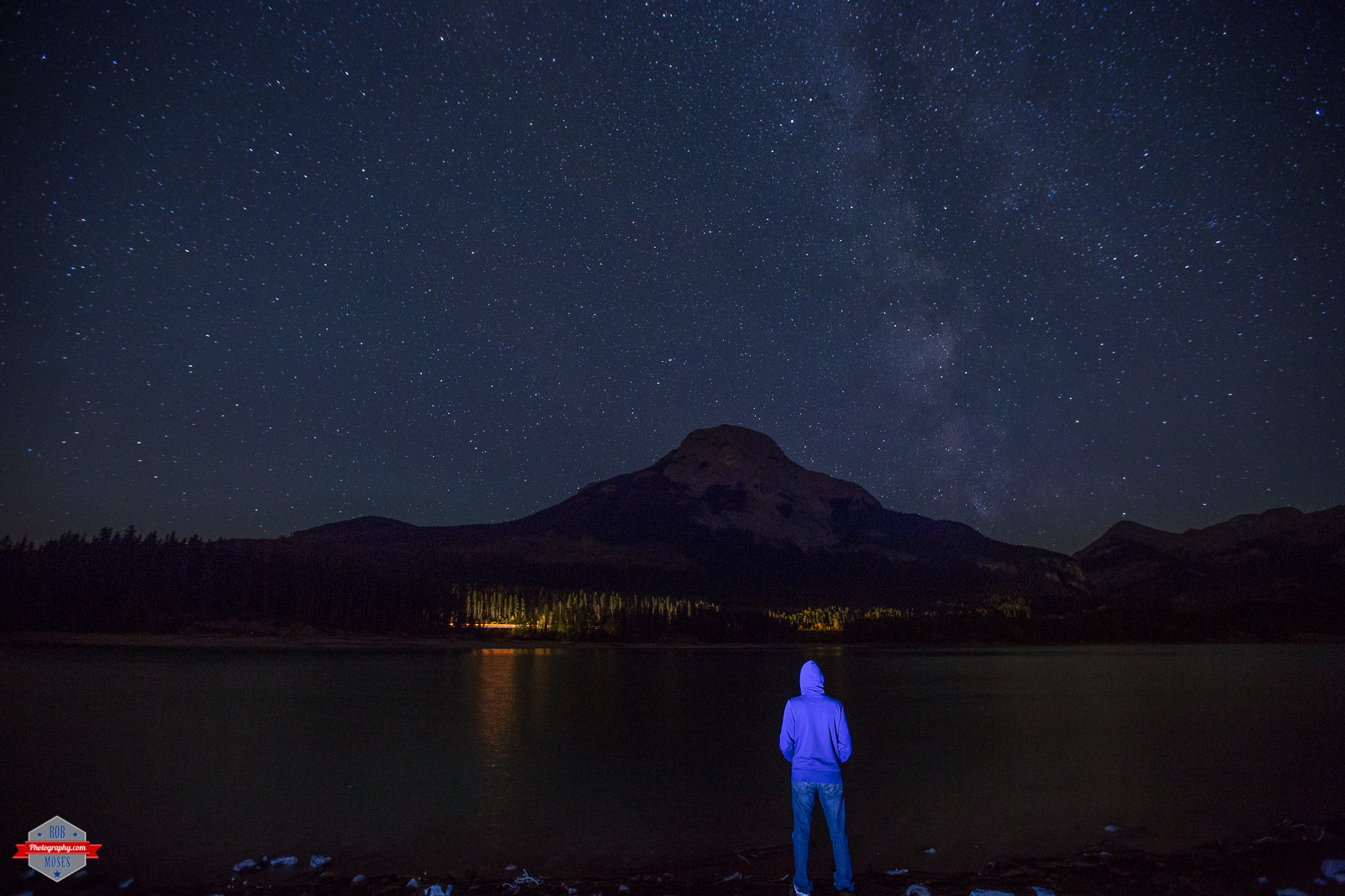 After shooting a number of shots from above a little cliff and then in the other direction all together, I decided to try getting some shots down by the lake. I had a square shaped LED flashlight with me and decided to try to see how it would look pointed at my back. I was happy with the first few attempts, but I knew I needed something just a little extra. I thought a little light on the water and in the trees would be just right, so I waited. . . And waited and waited until a I could hear a car approaching. I had the camera on a 10 second timer and a 13 second exposure, so I had hit it just at the right time for me to get the light where I wanted it. Lucky for me my estimation was about right and the light landed right where I wanted it too! That bit of light didn’t exactly make the photo, but it sure helped and was worth the wait.