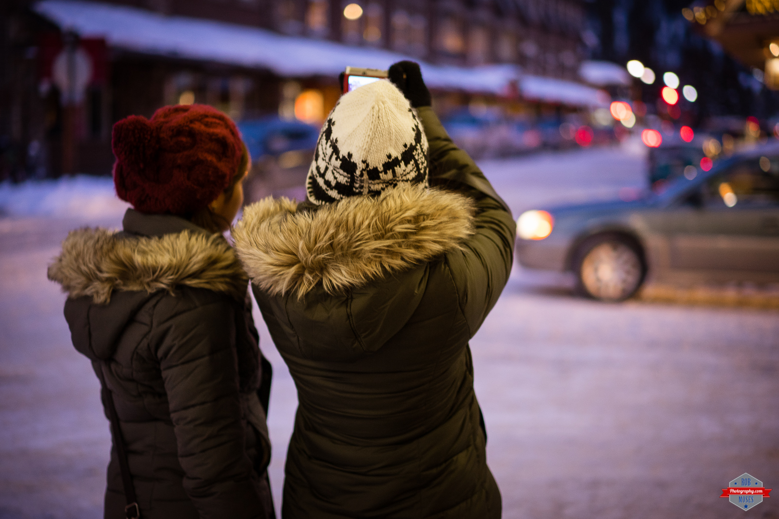 I was out shooting some street shots one night in Banff Alberta, Canada. At this point I was taking a picture looking down the street to my right. When I turned I saw these 2 girls taking pictures down the other street, so I quickly snapped a photo of them before the kept on their way and me on mine. I love these fleeting moments with people when shooting street photography.