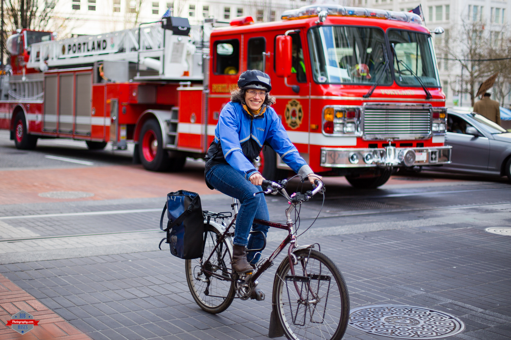 I was walking down the street when I noticed the bright red fire truck heading my way. Then the bright and happy cyclist caught my eye. Like an old west gun slinger, I whipped my camera in front of my face and snapped this photo. People like this make the world a better place and Portland is filled with them! 🙂