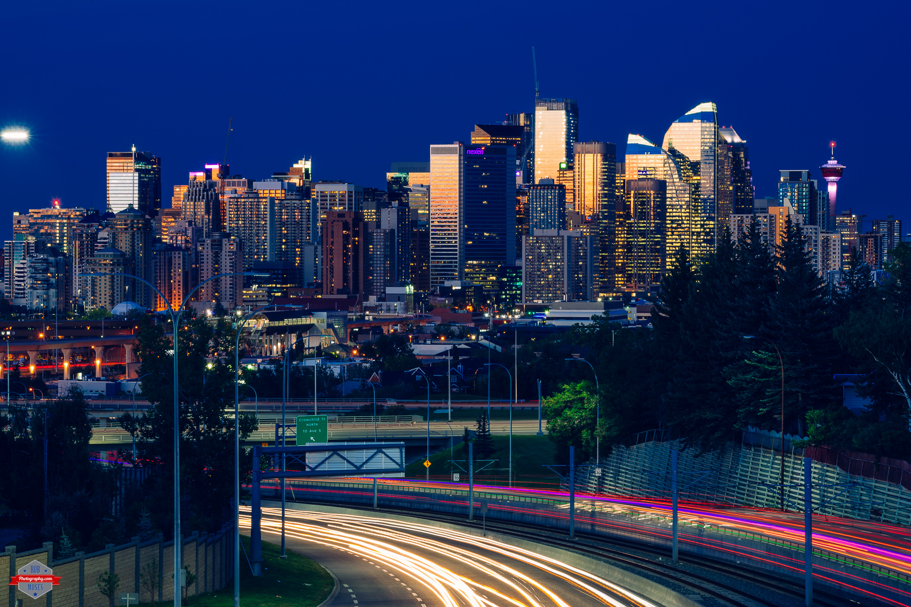We got some shiny buildings over here in Calgary. I like taking pictures from this side of town because when the sun sets you get this beautiful light hitting the buildings. I also timed out this shot so I would have lights from the cars and the train going by at the same time. I think the lights add a lot to the picture. The nice splash of colorful action at the bottom really rounds out the frame.