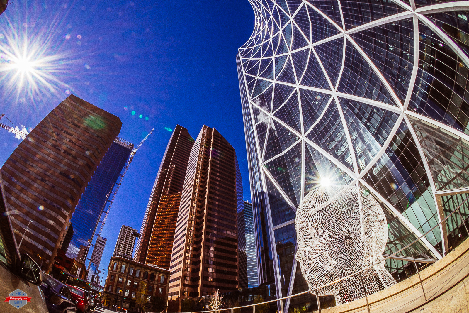I was downtown yesterday shooting some photos for a client. While I was down there I thought I’d grab a picture for you all too ;). The gigantic head on the right is actually quite big and it is lit up a night. The sun and sun reflection on the blue building make a fun addition to the photo.