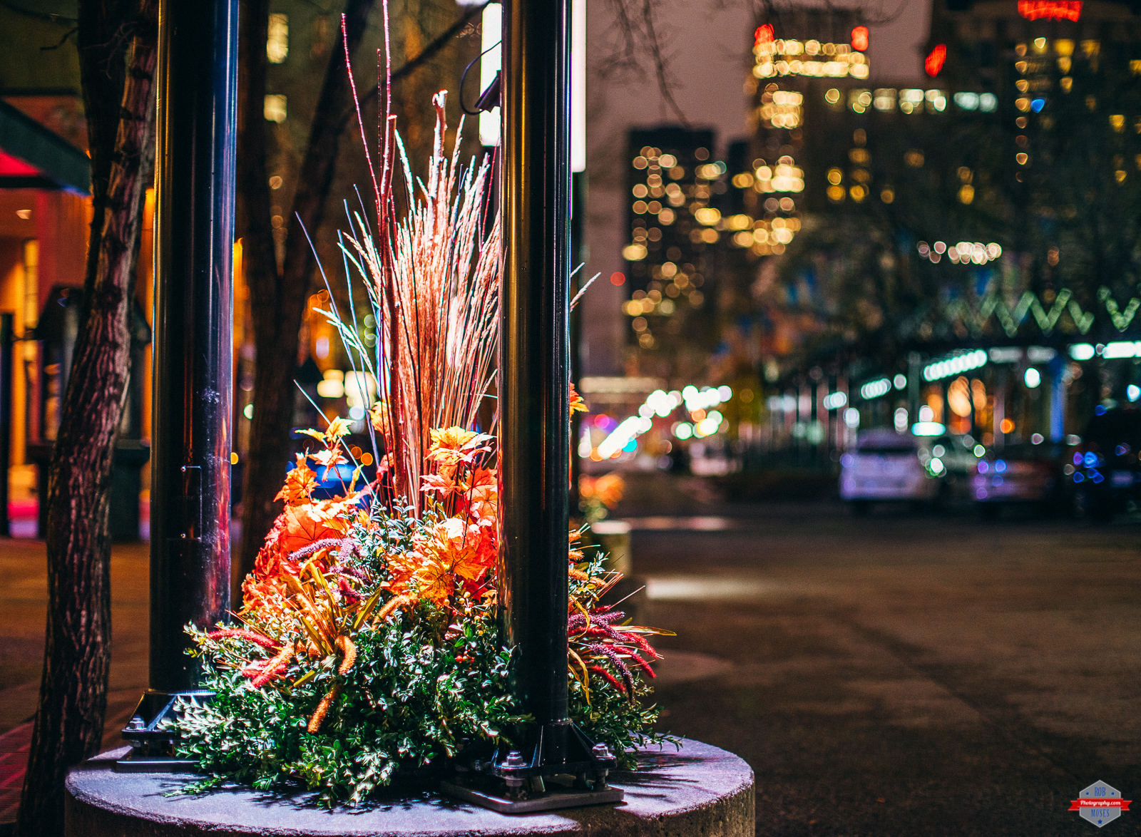 I was out taking pictures one night downtown in Calgary when I saw these crazy looking plants. They had some LED lights shinning on them and they would change color every few seconds. I though it looked kind of cool so I grabbed a quick shot. I shot this photo with my Sony a7ii & Canon FD 50mm f/1.2. I can’t remember my exact settings 100%, but I think I was at f/2.