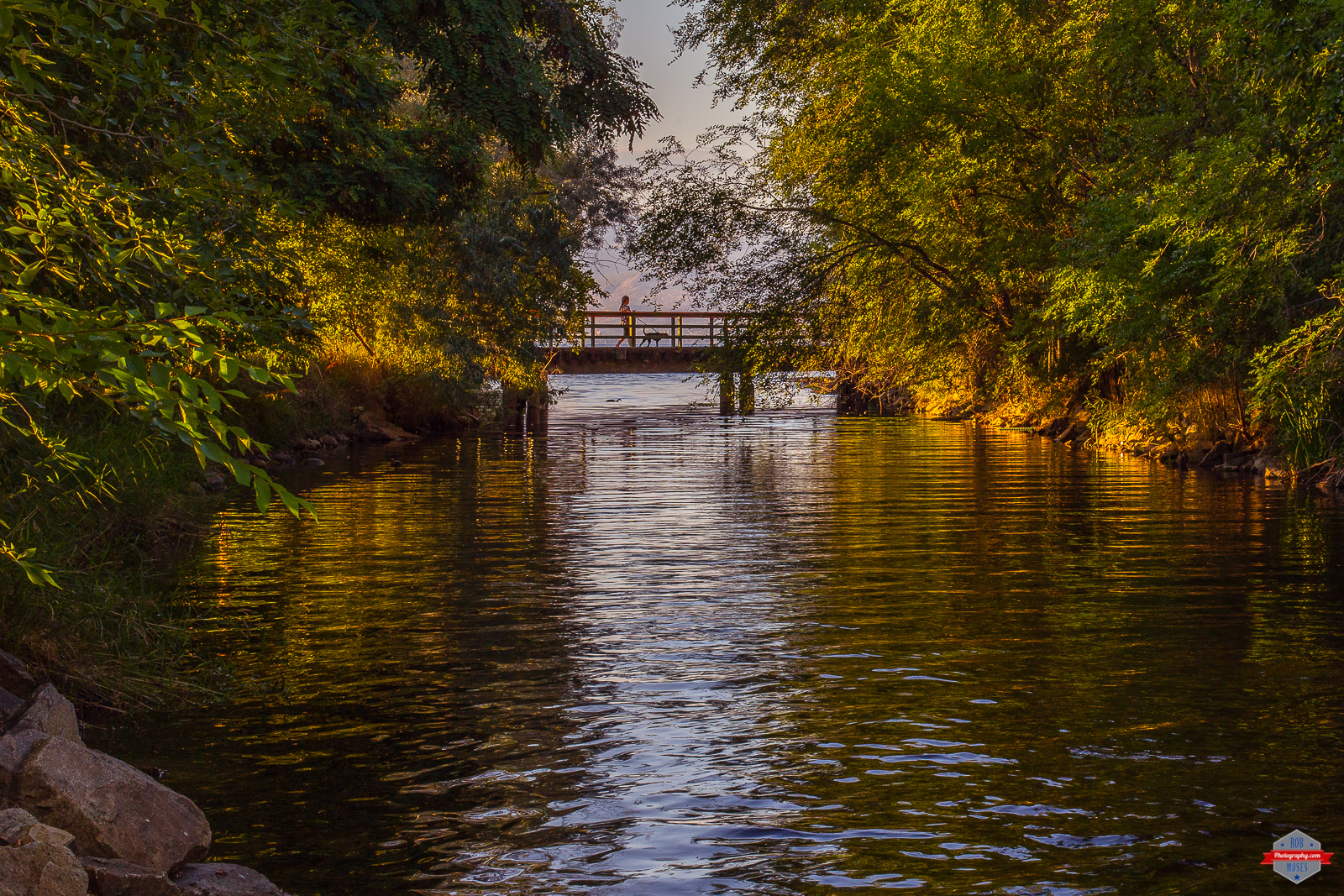 I just happened to be walking by this creek at just the right time it seemed. I saw the spot where I took this picture from the corner of my eye while I was walking by with my family. I told my family to keep going and I would catch up and ran over to the creek. I shot a few photos and just as I was about leave I saw this girl walking onto the bridge. I quickly whipped my camera back up and snapped the photo. It was a lucky break that she came walking along with her dog, because the photo with an empty bridge is just not the same.
