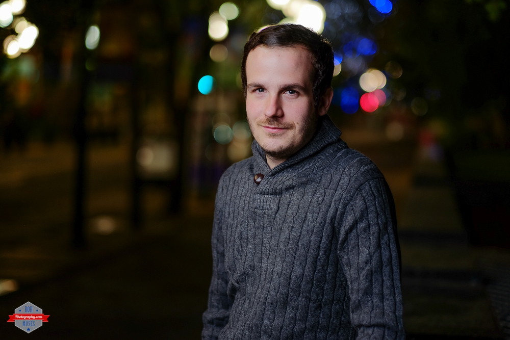 This a friend of mine, Paul. We met up around midnight, downtown in Calgary. The time might seem odd and it is, but for this particular picture it had to be late at night. You see, Paul is standing in the middle of the street at busy (during the day) intersection. I wanted to shoot this photo in this location because the street behind Paul has all these lights on the trees and I thought it would make for a nice/interesting blurry background. The 2nd shot was actually the very first picture I took of Paul that night. I was just shooting it to test the light. To be honest that first test shot is probably my favourite shot of the night haha.