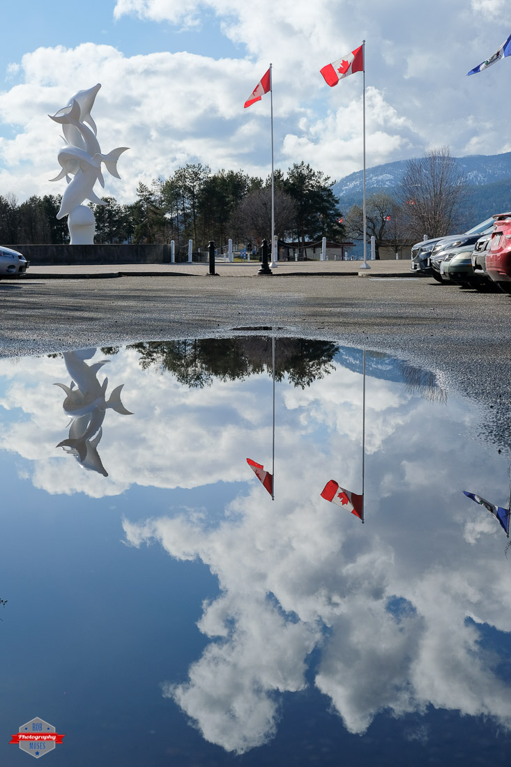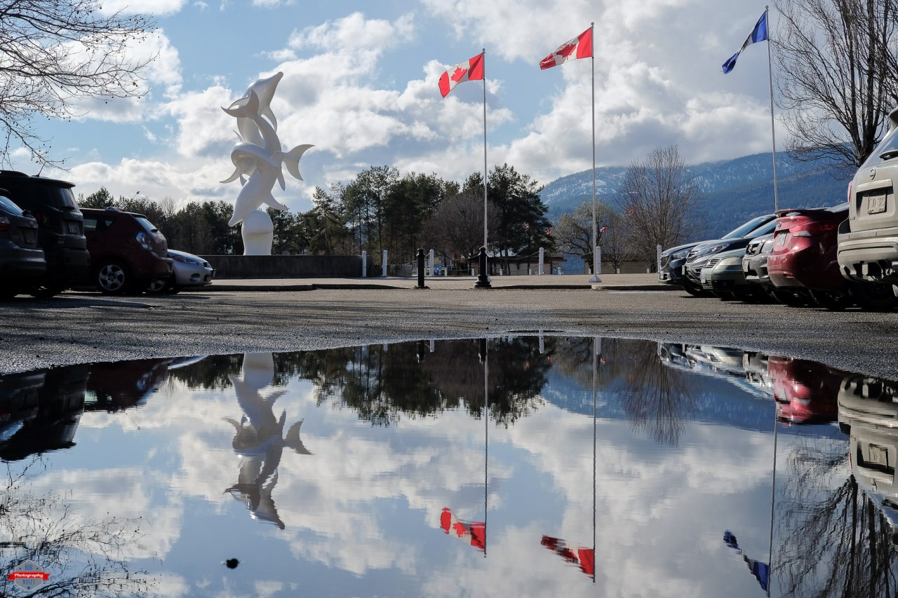 It was kind of rainy one morning this past weekend in Kelowna and then the sun came out and it was beautiful. When I saw that shinning down on the wet street I had an idea. Find a big puddle and shoot some reflection shots. I would have preferred to shoot these photos with something a little wider than 50mm, but since I only got the one Fuji lens (35mm on a crop sensor = 50mm equivalent) that’s what I was going to be using. I made my way downtown and just started walking around looking at the ground like a homeless crack head looking for spare change and cigarette butts. Lucky for me I decided to cut through this parking lot and wa-la, I stumbled on this massive puddle.