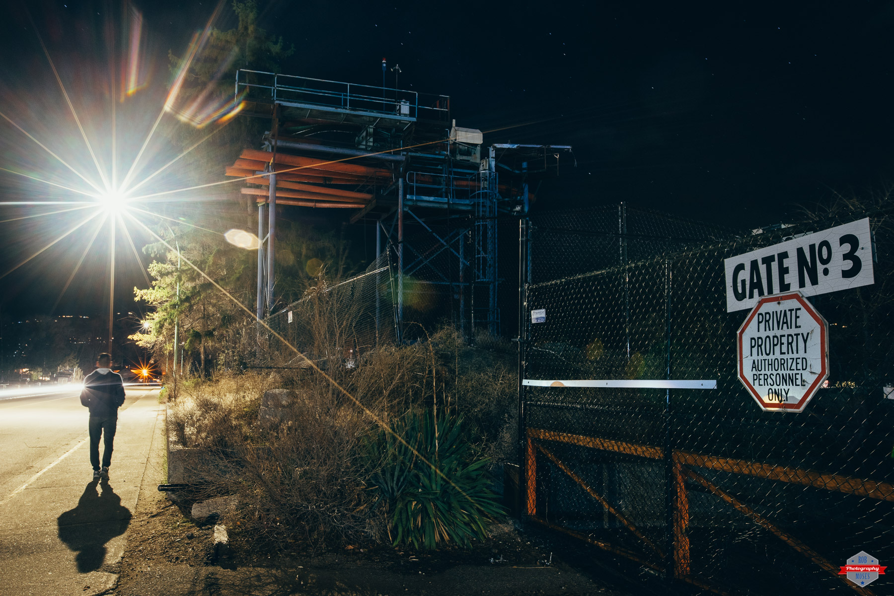 When I shot this photo I was actually looking for a spot to get a shot of a couple buildings. This gate with all the weird metal behind it kind of caught my eye. The old Gate No.3 sign and the metal structure behind the fence work well together and I though it’d make a cool picture. I knew straight away the picture was going to be better with someone walking down the street and with no one in sight that person was going to have to be me haha.