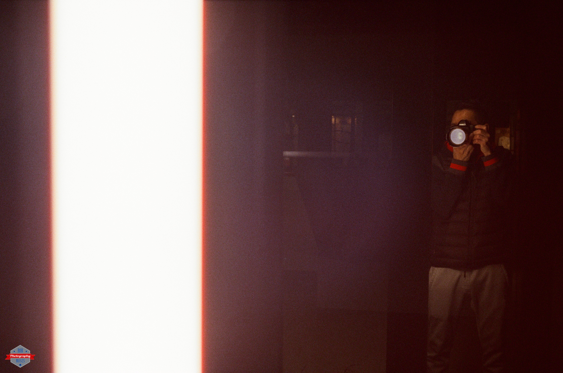 I didn’t plan this photo out. I was just taking pictures of my son sitting on his bike and I couldn’t help but notice the reflection in the window to my right. After I was doing shooting the photos of my son I figured I might as well just try and get a reflection shot. Normally I would have avoided having the big light in the frame, but because I was shooting with CineStill 800T film I knew the glow off the light would look unique, so I composed the light in the photo.