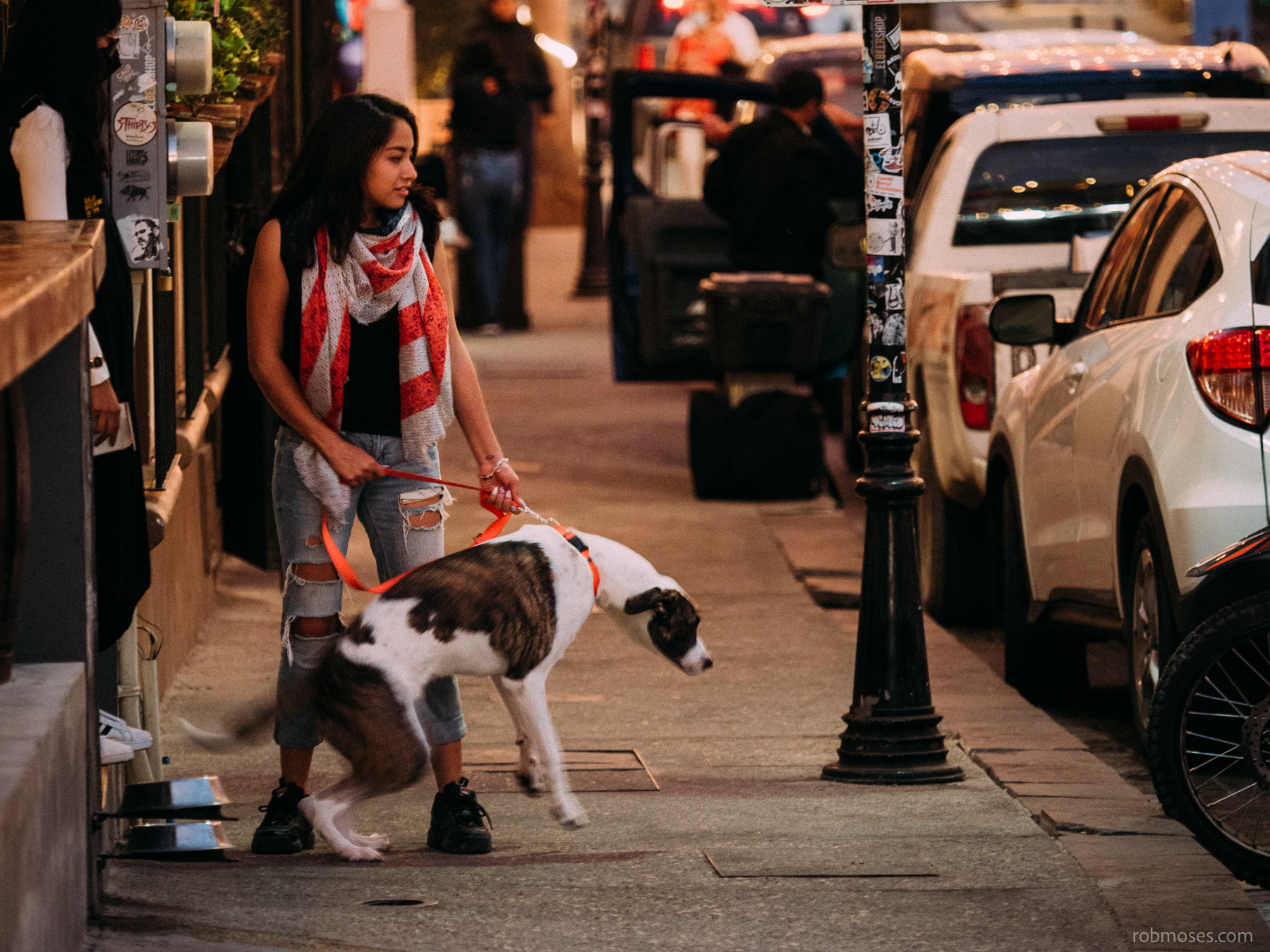 While I was walking around taking pictures one night I crossed paths with this girl walking her dog like 4 or 5 times. After I saw her a couple times I figured I might as well get a shot of her and her dog. What a life to live getting to walk your dog around this beautiful town everyday.