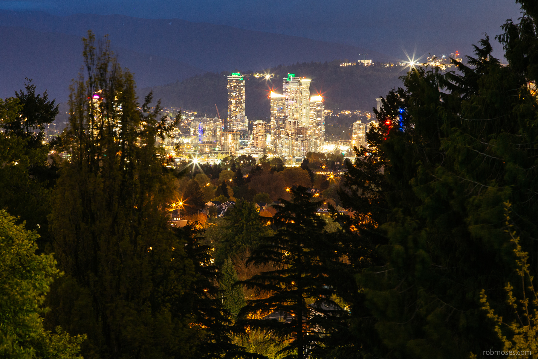 I was just sitting around one night in Vancouver and didn’t have any plans. I thought rather than just sit around doing nothing I’d hop in my car and go look for a photo. I didn’t have any plans on where I was going, I was just going. As I was driving I decided an easy location would be Queen Elizabeth Park, lots of parking and good views in most directions. In this picture you see some buildings in one part of Burnaby through the trees. It’s not a typical picture of Burnaby and that’s what I like about the photo.