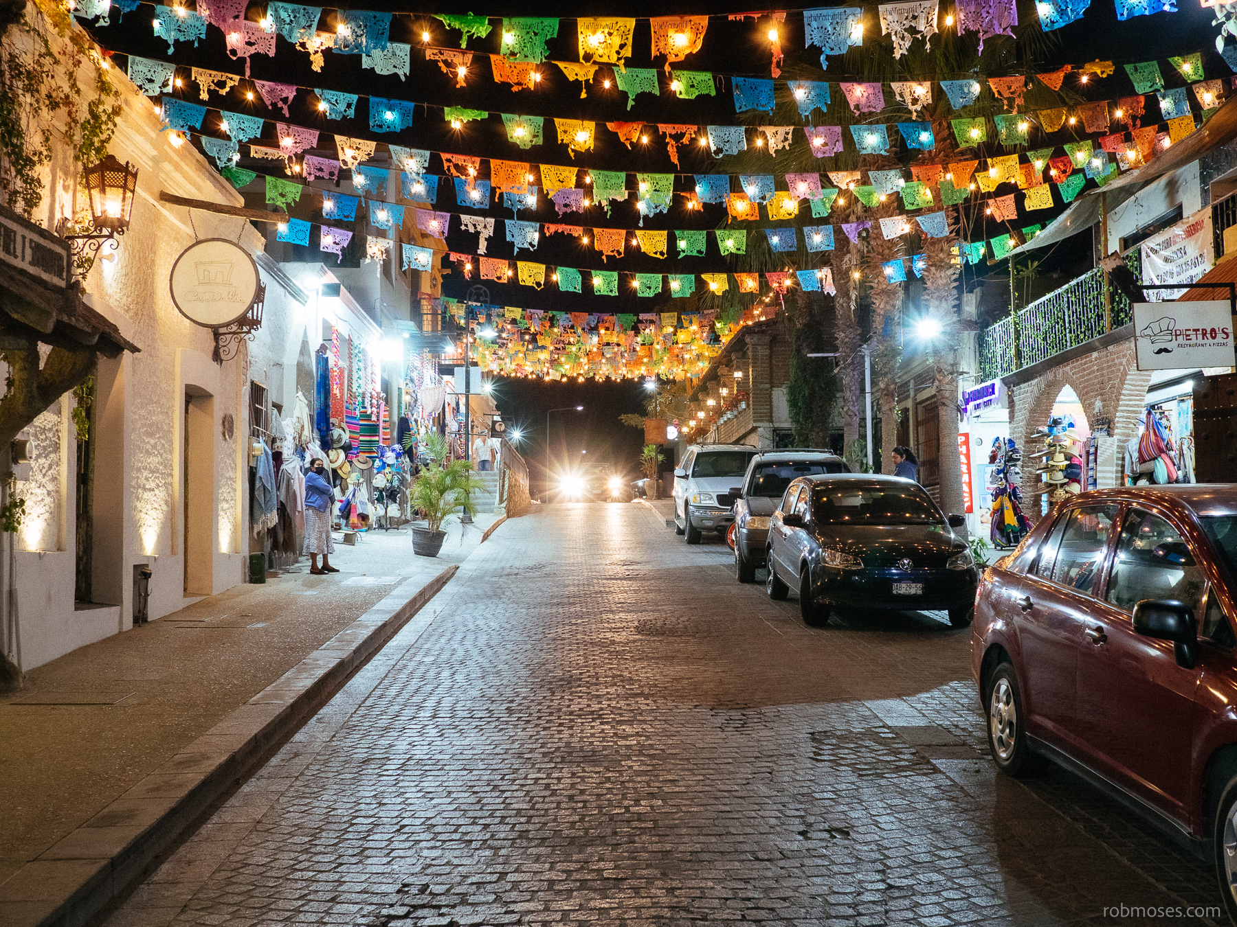 I wish the streets in my town looked like this. All the lights and little flags look so wonderful at night. The ambiance of the lights makes you feel like your walking around in a movie or something. It’s amazing what a small thing like lights and colorful flags can do for a street. Of course all the old buildings and cobblestone streets play a massive part in the overall feel of the street, but to me the lights are what put it over the top in San José del Cabo.