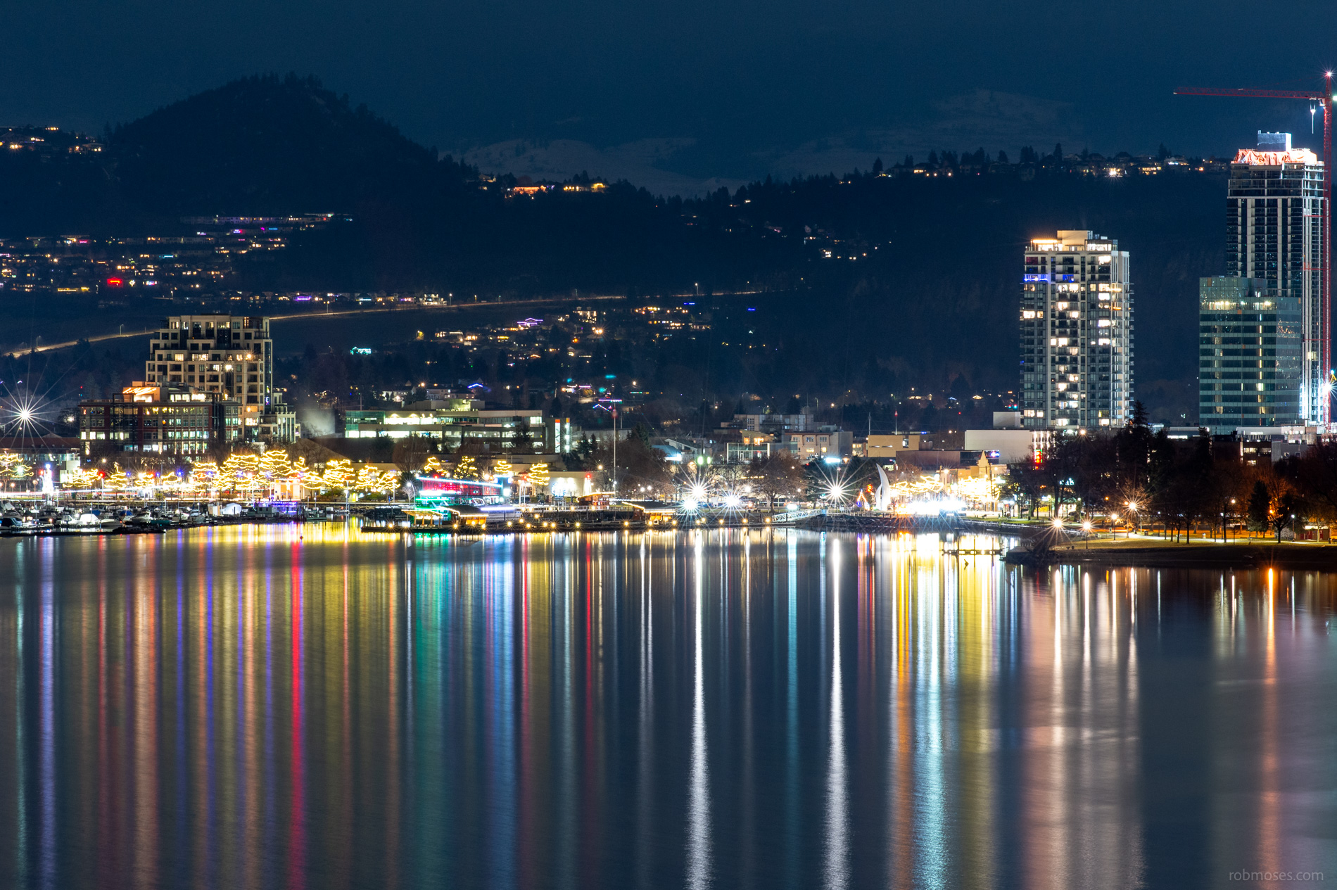 I went out last night with a 70-200 and nothing else. It’s probably a good thing too because if I had another longer lens, I surely would have used it and I think that would have been a mistake. For this particular photo with all the colourful lights reflecting off the lake I think 200mm is just about right.