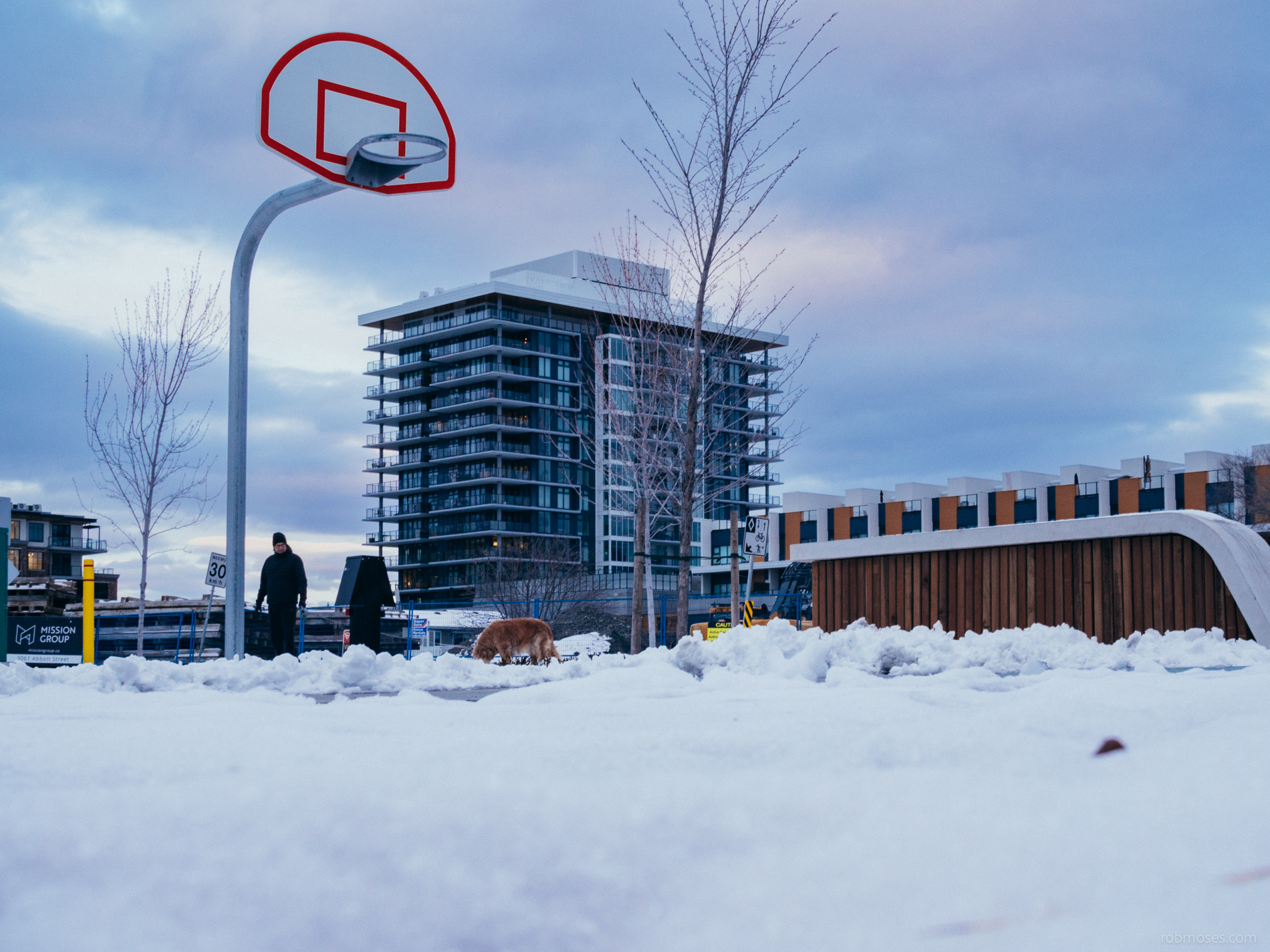 Well the snow has landed in Kelowna and does not show any signs of going anywhere anytime soon. Yesterday I knew I had to get out the door for a picture and it had to have snow in it. I didn’t know what I was going to shoot when I went out, so I dressed warm and just started walking around the neighbourhood. When I got this is park I knew I was running out of light in a hurry, so I just started shoot photos of this snowy basketball court. At first I wasn’t sure if it was something I would use, but then the guy with the dog walked into the scene and I knew I had something.