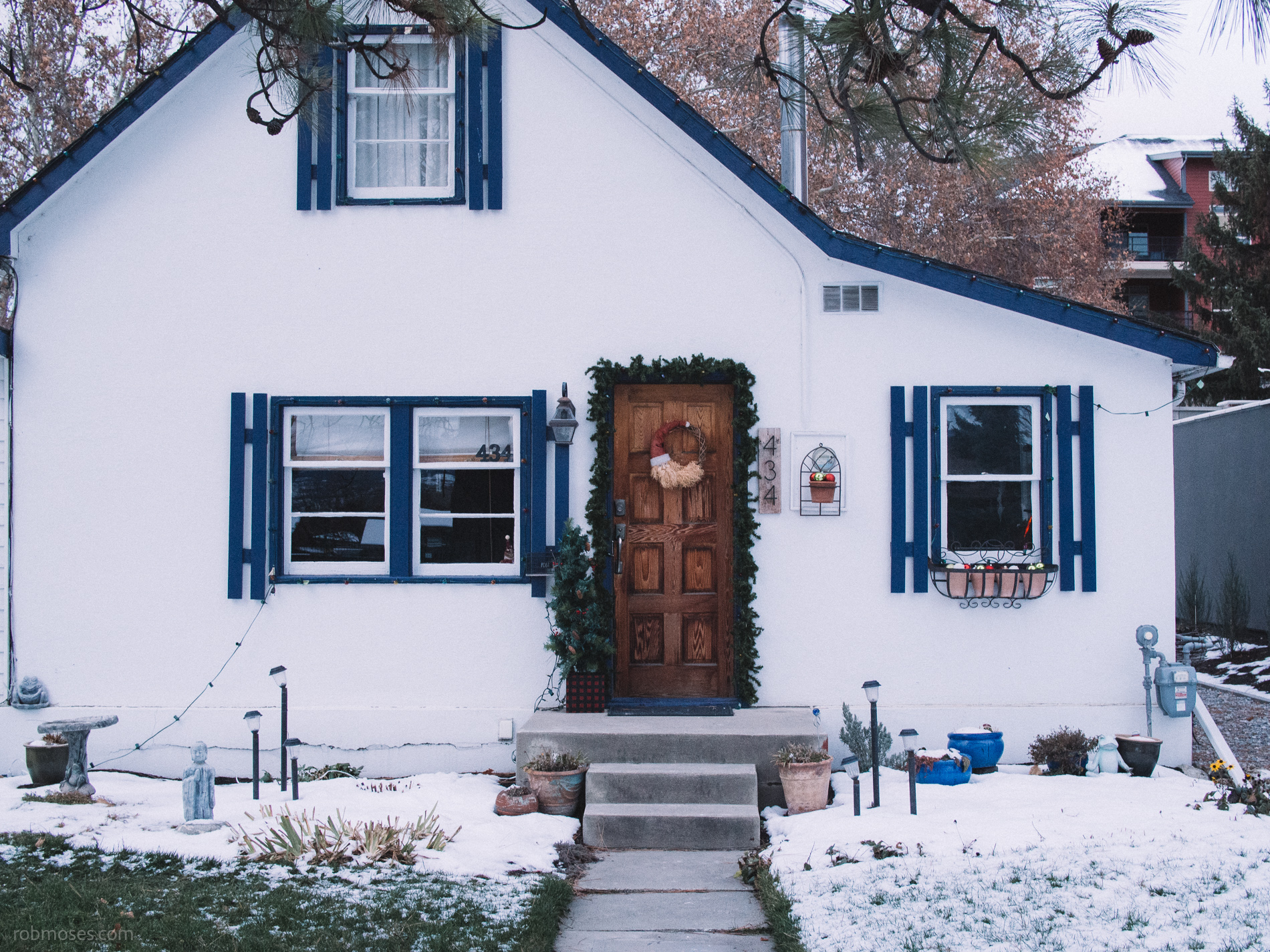 The white house is very country-looking, and especially charming sitting in the snow.