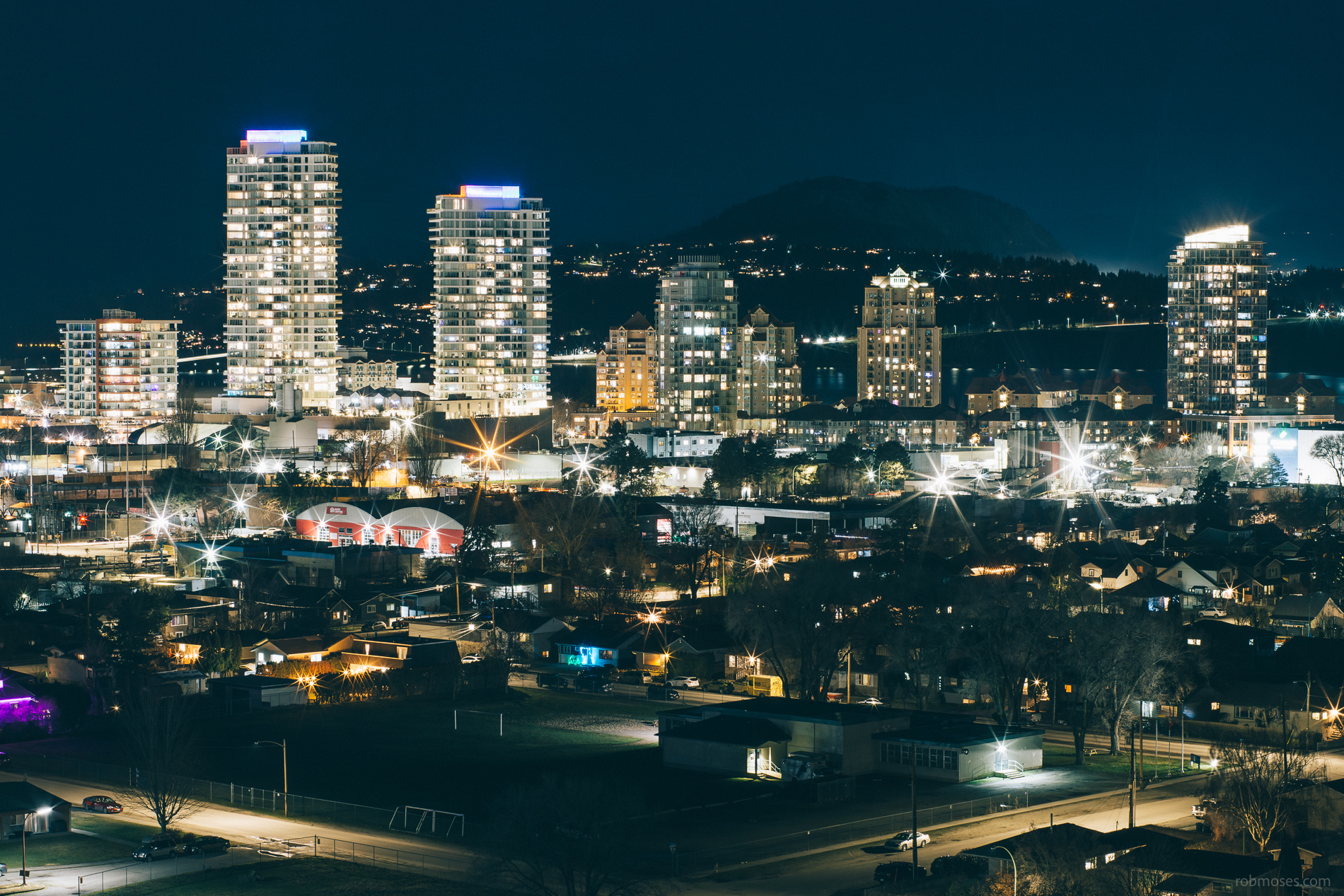 For me this view has it all, it’s urban but still has regular looking inner city neighbourhood in the foreground. There are buildings, bright lights and you can see the lake and some mountains in the distance. If someone asked me where a good view of Kelowna was I would take them here.