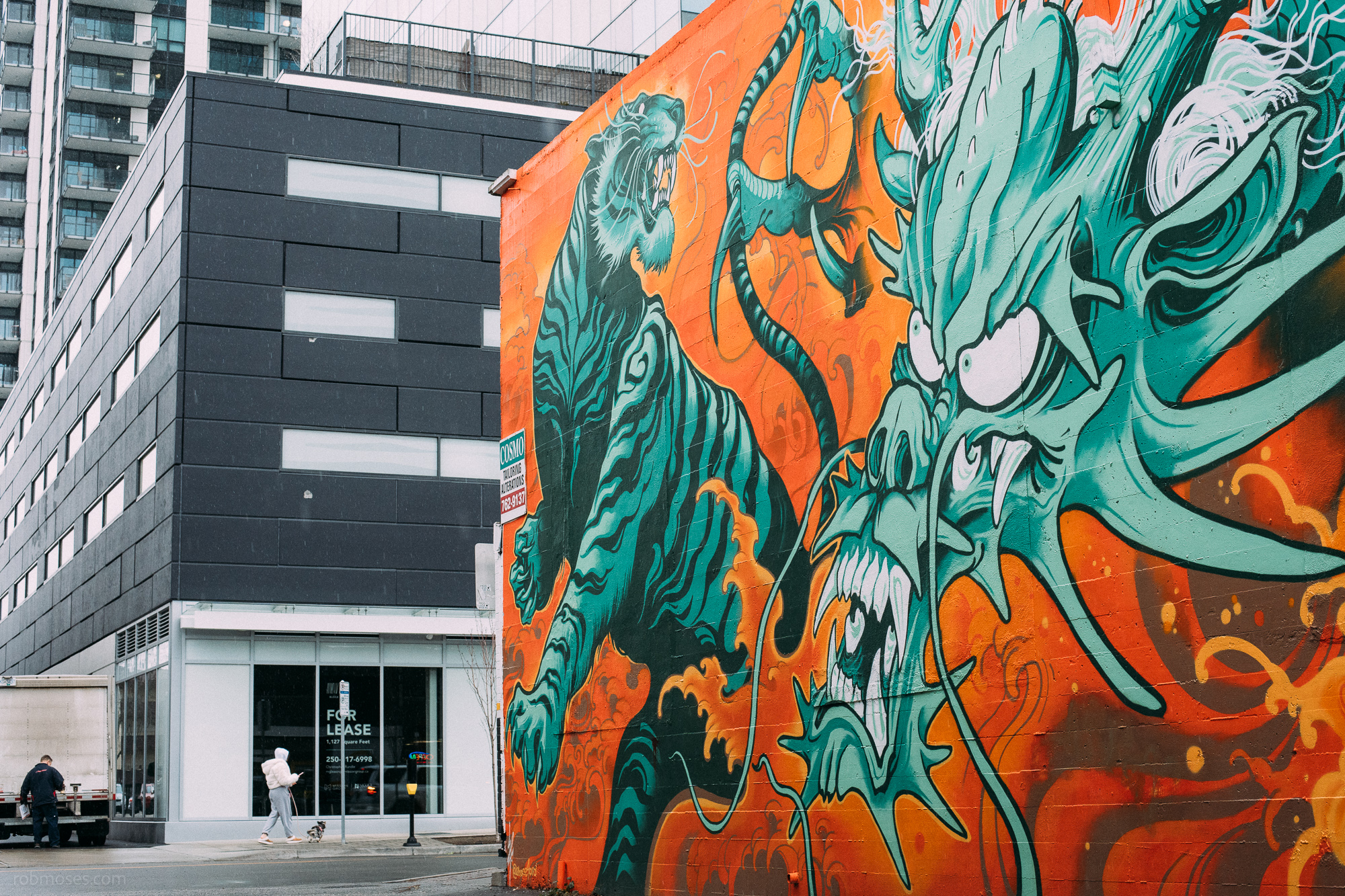 I was walking around downtown yesterday looking for a photo. I saw this Tiger and Dragon mural and thought it would look good in a street shot. I shot relatively low so I could get more of the buildings across the street into the shot. The buildings across the street are kind of dull in comparison to the mural. I figured getting a decent mount of those buildings in the shot would provide some good contrast to the bright colours of the mural.